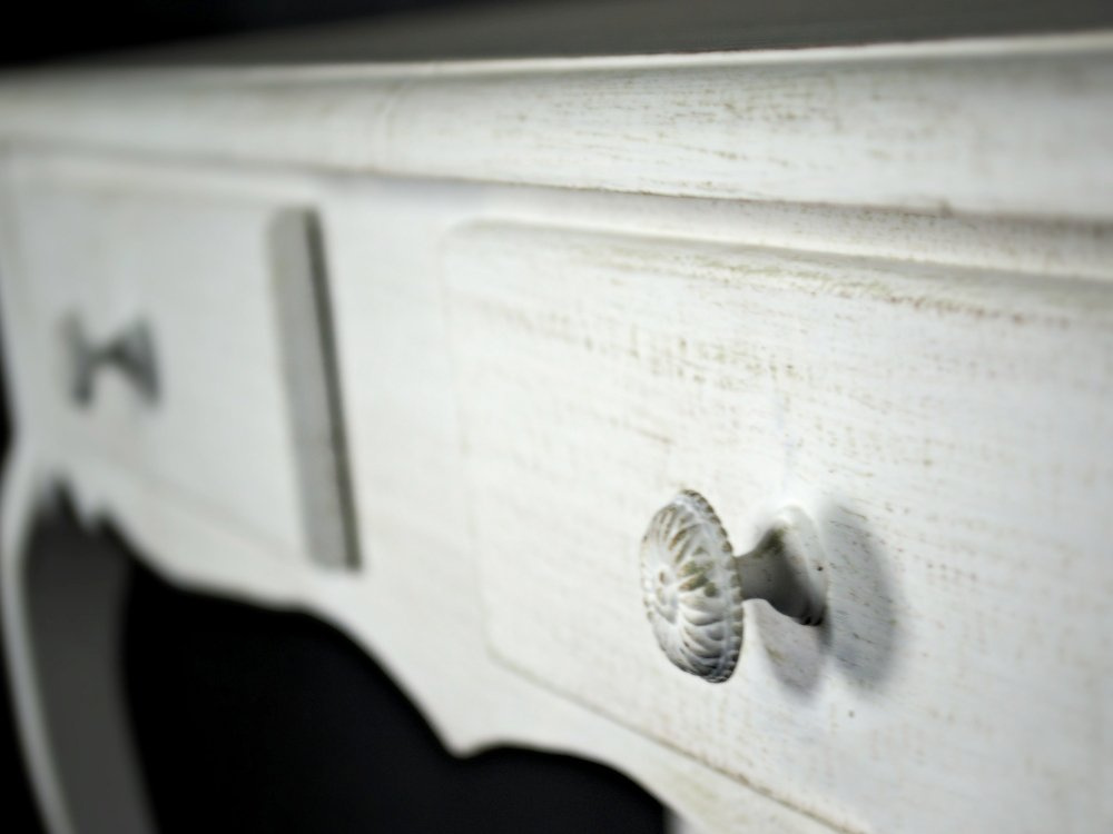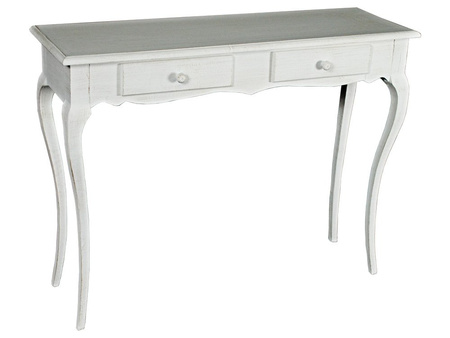 Przyścienna konsola z funkcjonalnymi i bardzo praktycznymi szufladami, w których pomieścisz wszystkie podręczne drobiazgi. Wykonana z drewna, następnie pokryta białym lakierem, delikatnie zeszlifowanym. Stylizowane, gięte nóżki podkreślają wyjątkowy, elegancki design.
