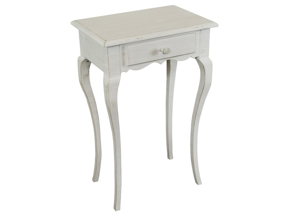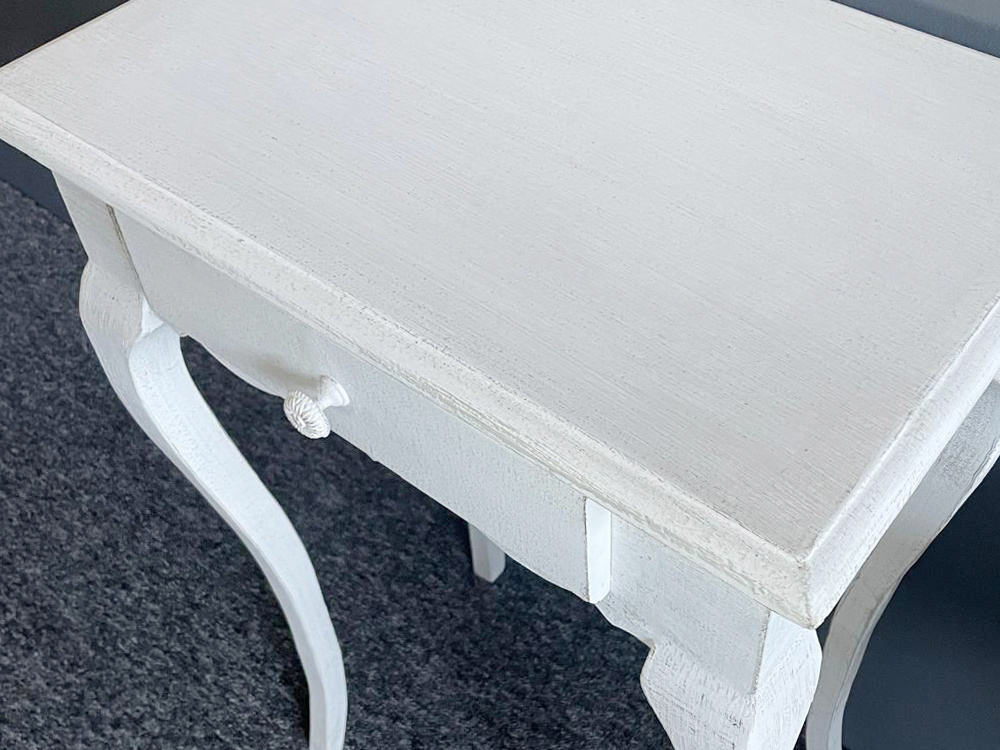 - Stylowa szafka pokryta białym lakierem przecieranym, wykonana z wysokiej jakości drewna, posiada stylizowane nóżki. Szafka ma szufladę na drobne przedmioty. Doskonale komponuje się we wnętrzach stylizowanych jak i nowoczesnych.