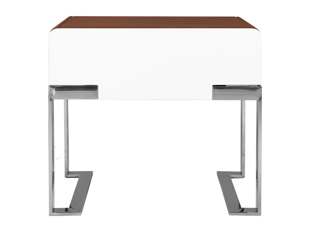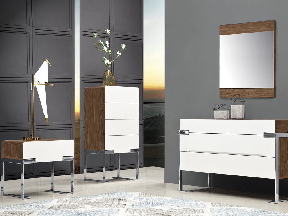 - Elegancka szafka z białym frontem na wysoki połysk wykonana z połączonych materiałów, drewna, stali. Cztery pojemne szuflady pomieszczą wszystkie potrzebne przedmioty. Szafka doskonale spełni swoją funkcję zarówno w sypialni jak i przedpokoju.