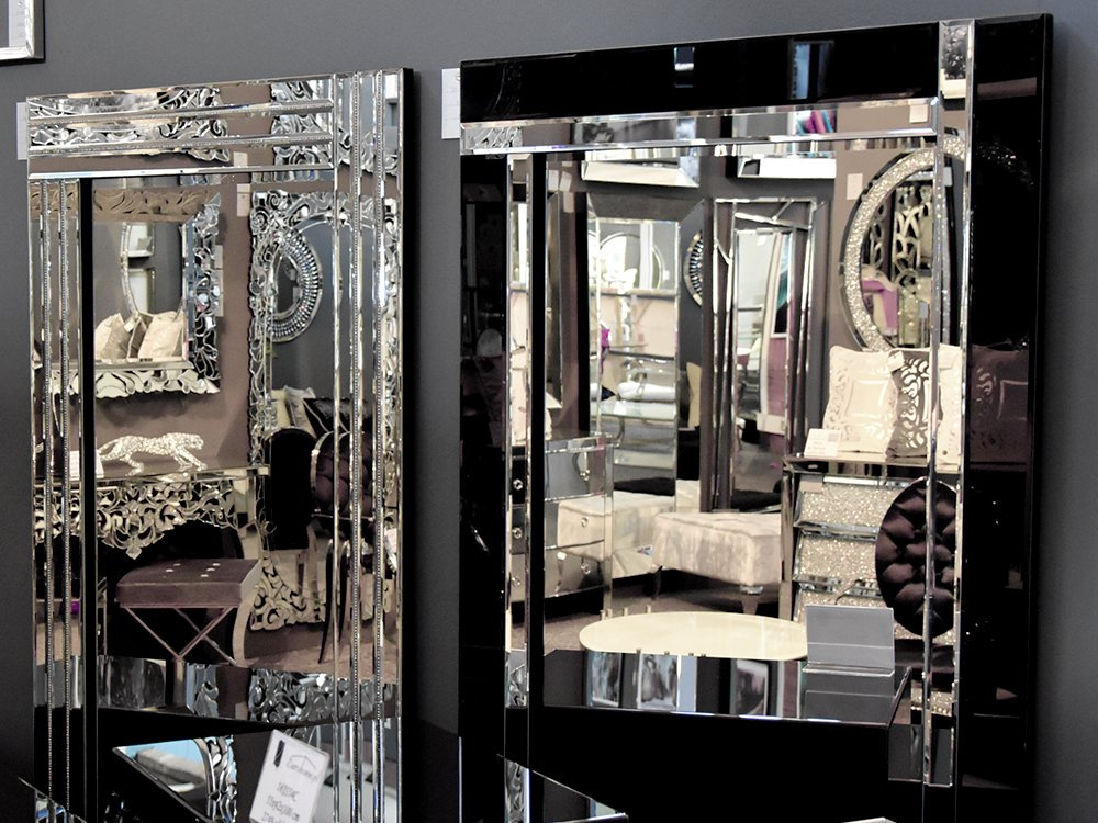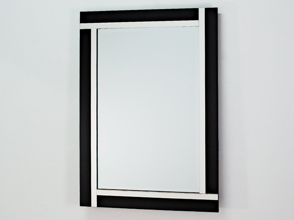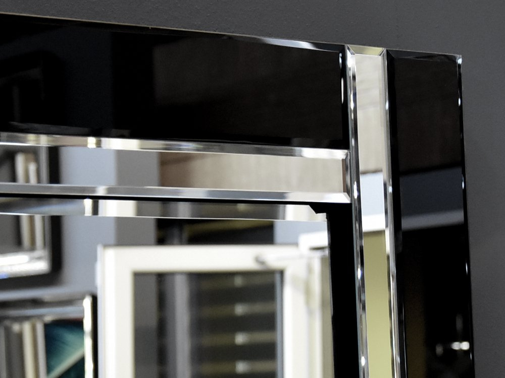 - Nowoczesne, minimalistyczne lustro w klasycznej ramie wykonanej z połączonych elementów czarnego szkła i lustra, zakończonych fazą.