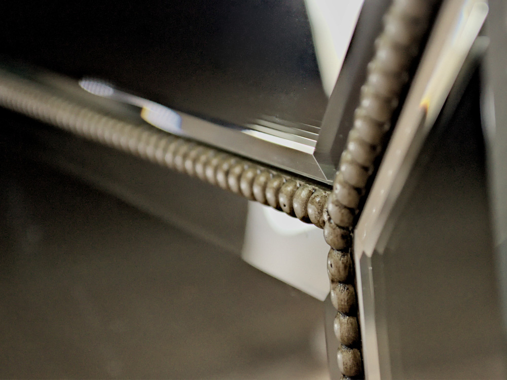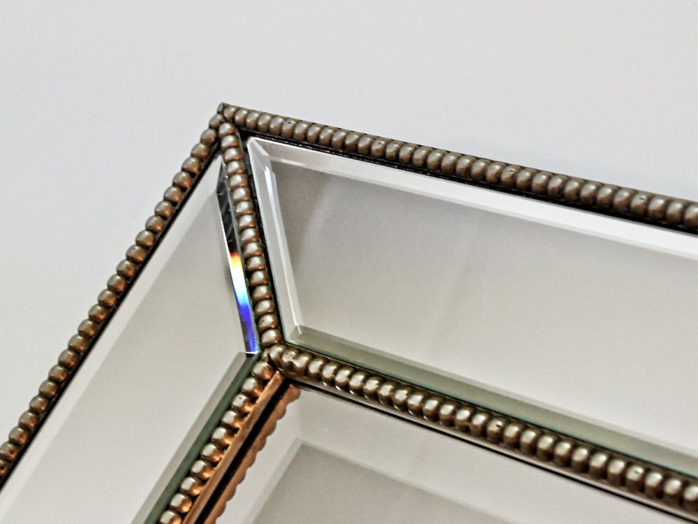 - Klasyczne lustro z fazowanymi frontami, inkrustowane miedziano-złotymi "perełkami". Prosty i uniwersalny design sprawia, że ten model będzie doskonałym wyborem dla wnętrz o zróżnicowanej stylistyce, delikatnie nawiązując do estetyki retro.