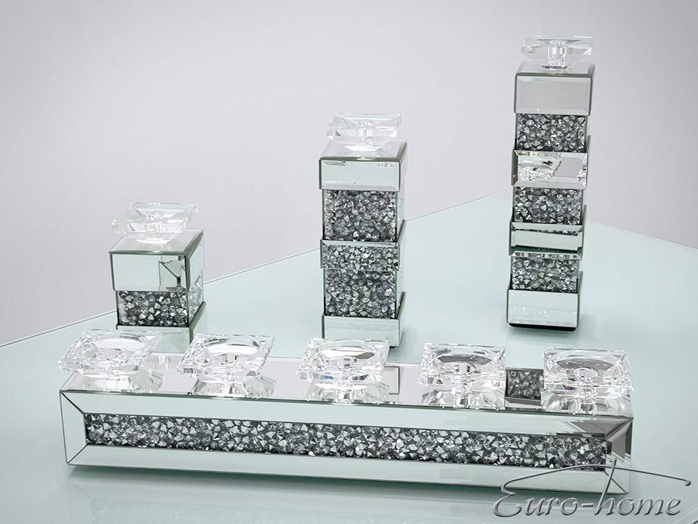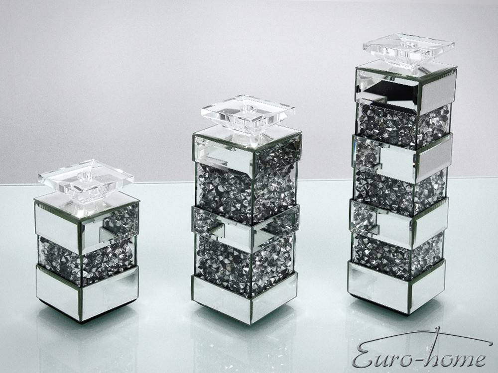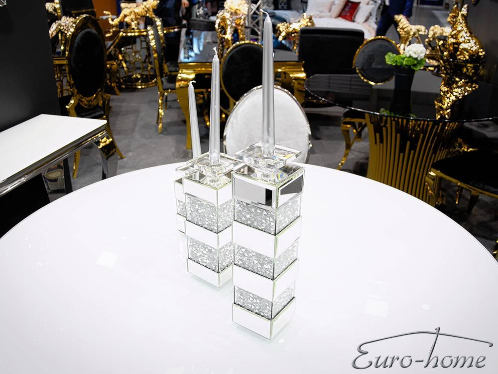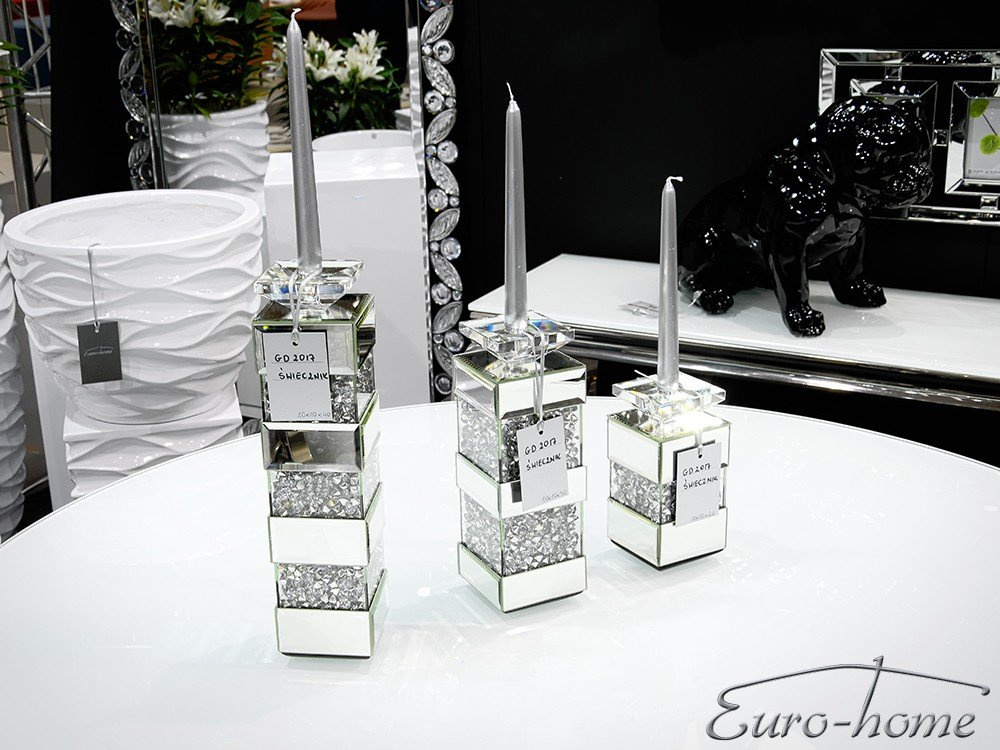 - Wytwornie zdobiony świecznik, wykonany z lustrzanych dyskretnie fazowanych elementów oraz drobnych kryształków.