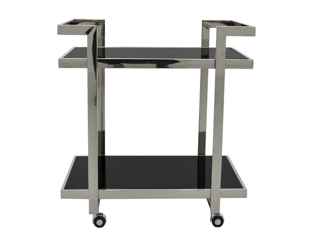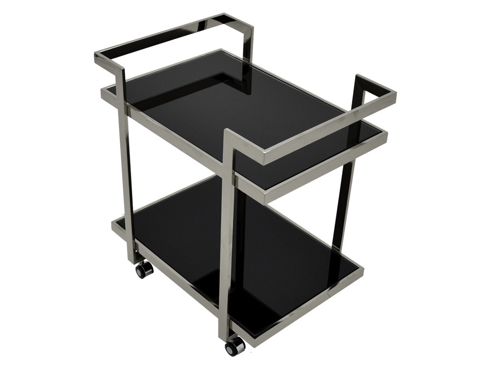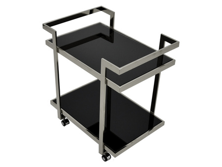 Mobilny barek na kółkach wykonany z wysokiej jakości stali nierdzewnej. Ten pozornie stawiający na funkcjonalność mebel dzięki wyrafinowanemu połączeniu stali i czerni sprawia, że będzie wyjątkowym elementem każdego szykownego salonu.