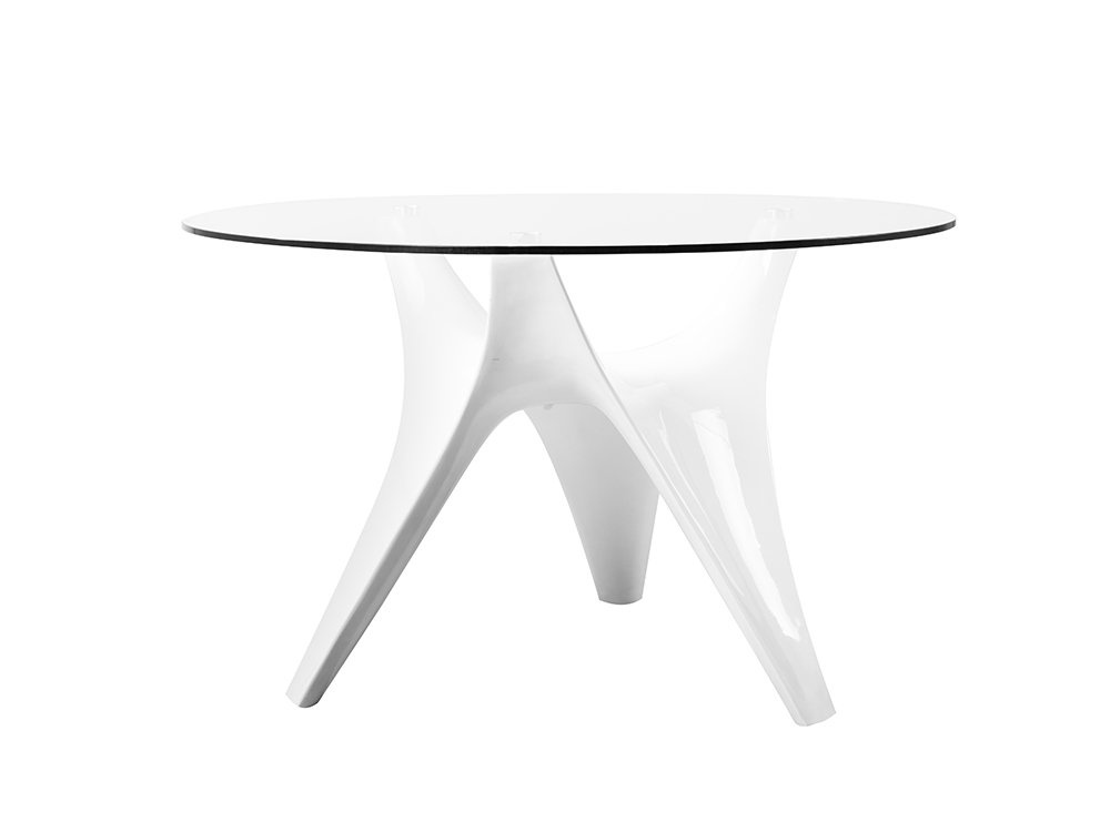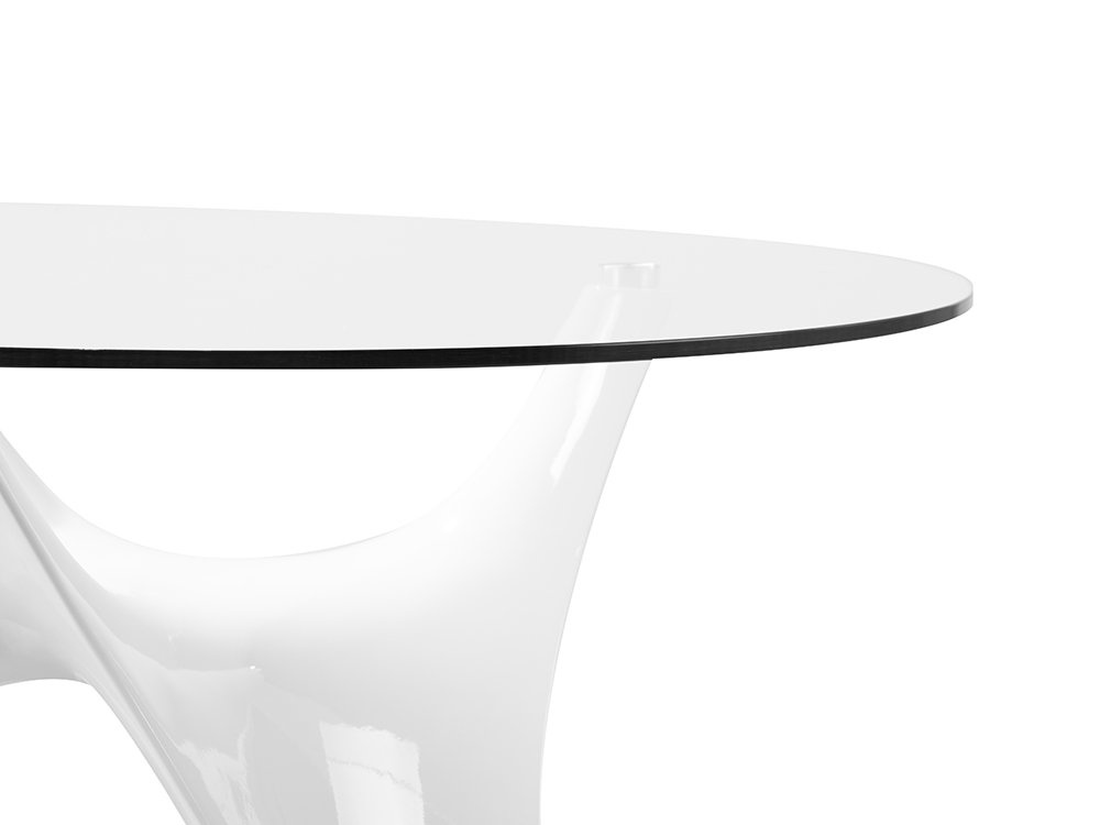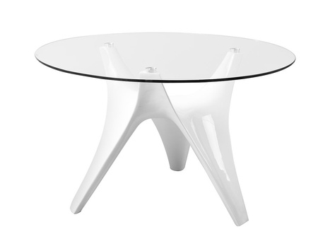 - Designerski stół który doskonale uzupełni wnętrze nowoczesnego salonu czy jadalni. Okrągły, transparentny blat osadzono na białej, błyszczącej podstawie tworząc wyjątkowy efekt.