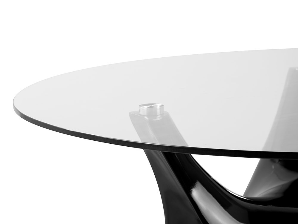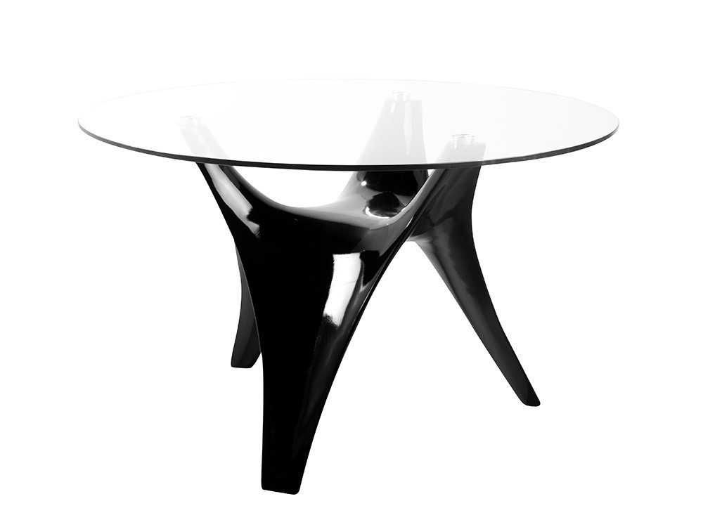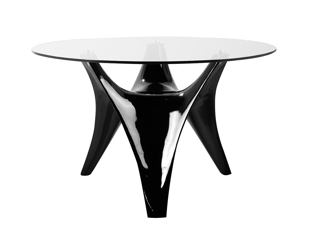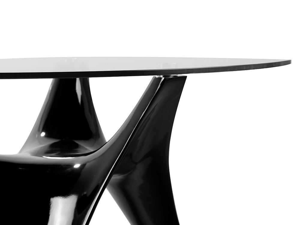 - Designerski stół który doskonale uzupełni wnętrze nowoczesnego salonu czy jadalni. Okrągły, transparentny blat osadzono na czarnej, błyszczącej podstawie tworząc wyjątkowy efekt.