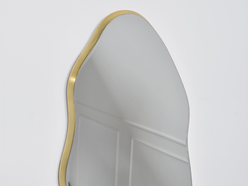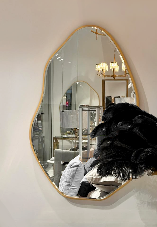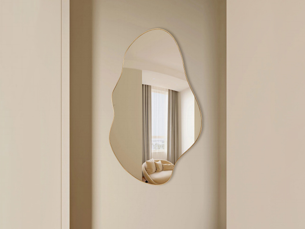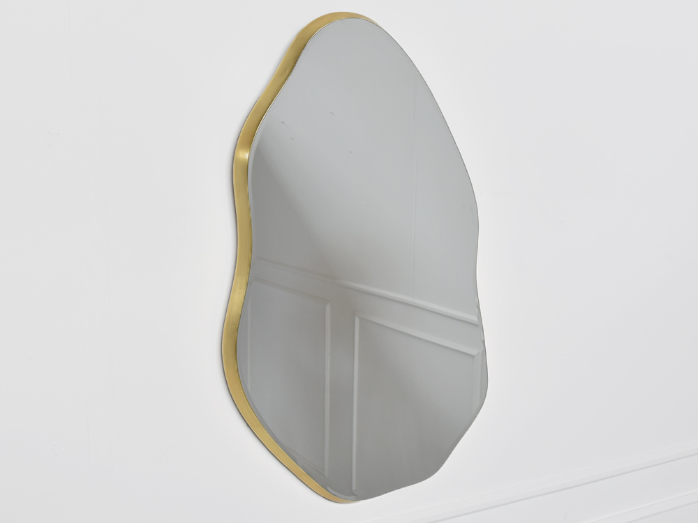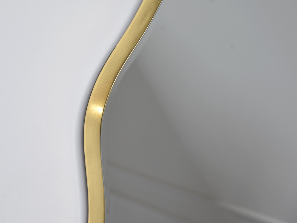 - Asymetryczne złote lustro, którego kontury przypominają abstrakcyjne kształty tworząc dynamiczny i interesujący efekt wizualny. Subtelne złote wykończenie idealnie komponuje się z różnymi stylami wnętrz, od nowoczesnych po klasyczne.