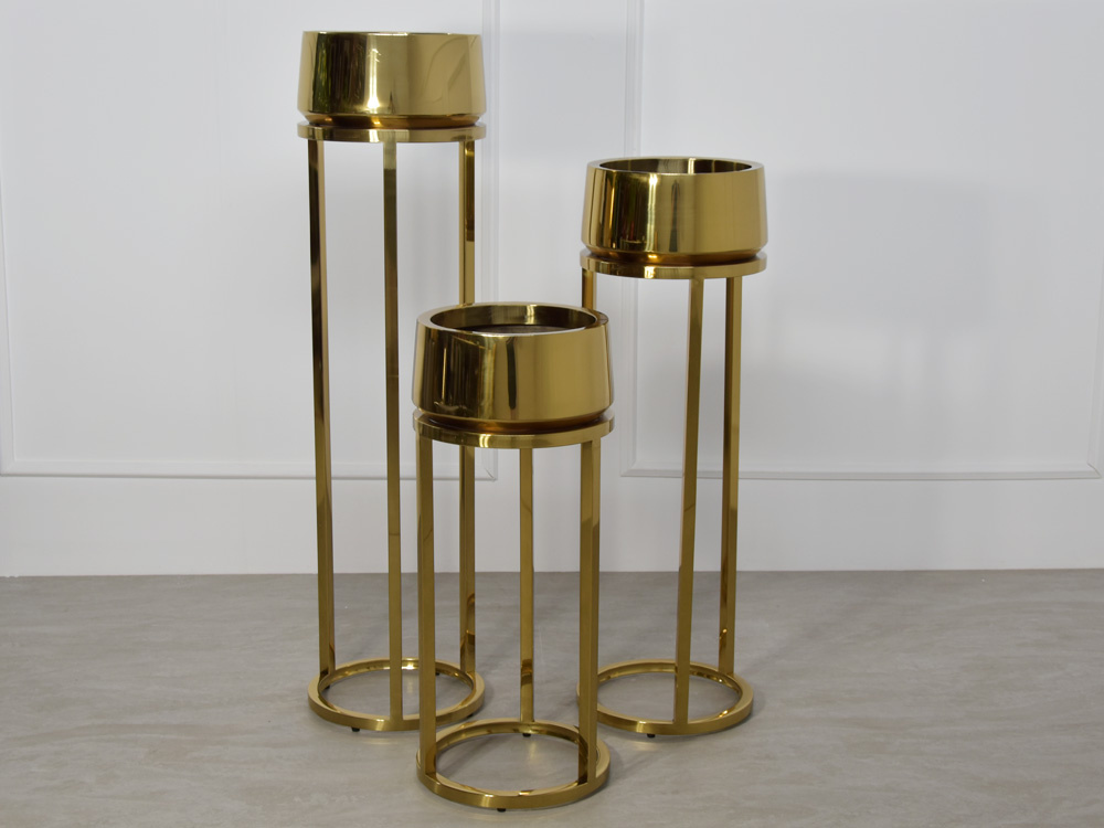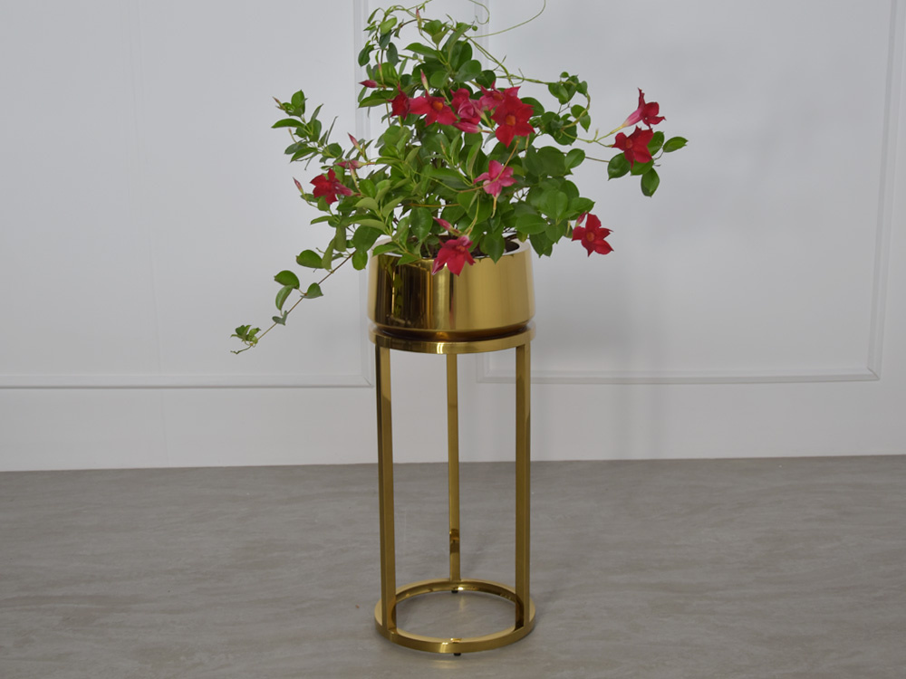 - Elegancka wysoka donica wykonana ze stali nierdzewnej, której powierzchnia ma fakturę lustra w kolorze złota. Będzie mocnym akcentem dekoracji wnętrz o różnej stylistyce.