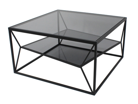 Designerski, nowoczesny stolik kawowy którego podstawa została wykonana z polerowanej stali nierdzewnej. Uwieńczony blatem z grafitowego, hartowanego szkła oraz z dodatkową półką pod blatem.