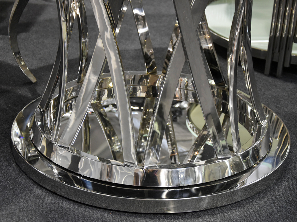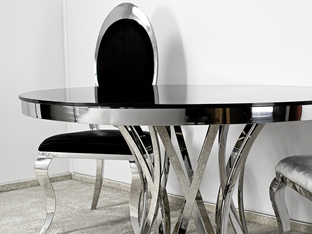 - Wyjątkowo efektowny stół wykonany z polerowane stali nierdzewnej w kolorze srebra. Zaprojektowany w duchu art deco, z dekoracyjną podstawą przypominającą pnący się motyw roślinny. Uwieńczony okrągłym, czarnym blatem ze szkła hartowanego. .