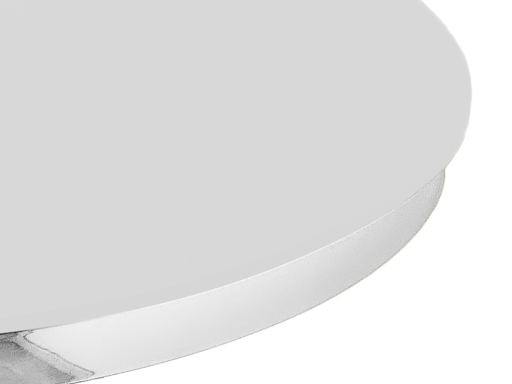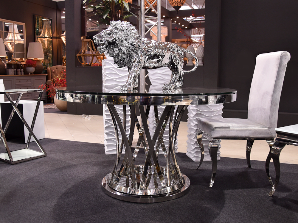 - Wyjątkowo efektowny stół wykonany z polerowane stali nierdzewnej w kolorze srebra. Zaprojektowany w duchu art deco, z dekoracyjną podstawą przypominającą pnący się motyw roślinny. Uwieńczony okrągłym, białym blatem ze szkła hartowanego. .