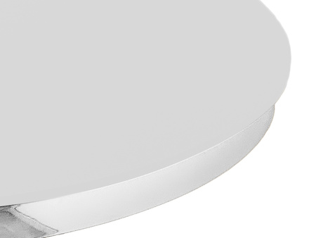 Wyjątkowo efektowny stół wykonany z polerowane stali nierdzewnej w kolorze srebra. Zaprojektowany w duchu art deco, z dekoracyjną podstawą przypominającą pnący się motyw roślinny. Uwieńczony okrągłym, białym blatem ze szkła hartowanego. .