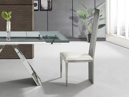 - Designerskie, wysokie krzesło z finezyjnym oparciem wykonanym z polerowanej stali nierdzewnej. Połączenie welurowej tkaniny oraz złotej podstawy tworzy niezwykle elegancki design. Ergonomiczny profil pozwala na wygodę i komfort siedzenia.