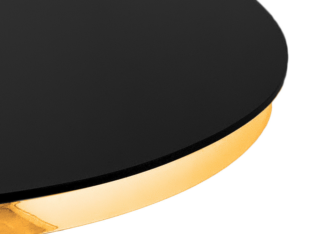 Wyjątkowo efektowny stół wykonany z polerowane stali nierdzewnej w kolorze złota. Zaprojektowany w duchu art deco, z dekoracyjną podstawą przypominającą pnący się motyw roślinny. Uwieńczony okrągłym, czarnym blatem ze szkła hartowanego. .
