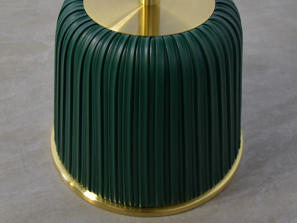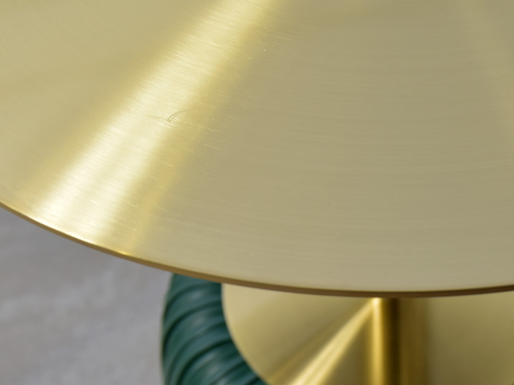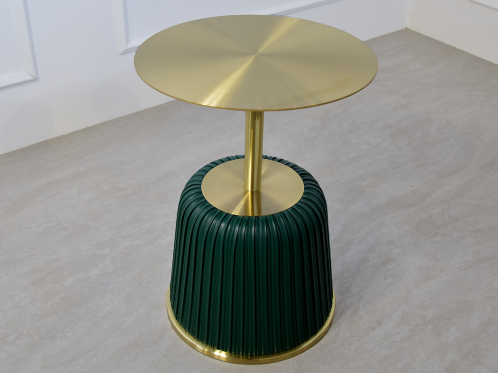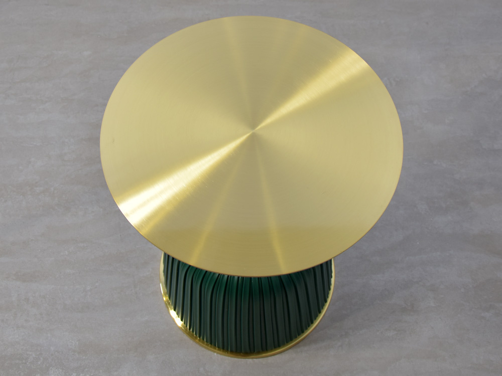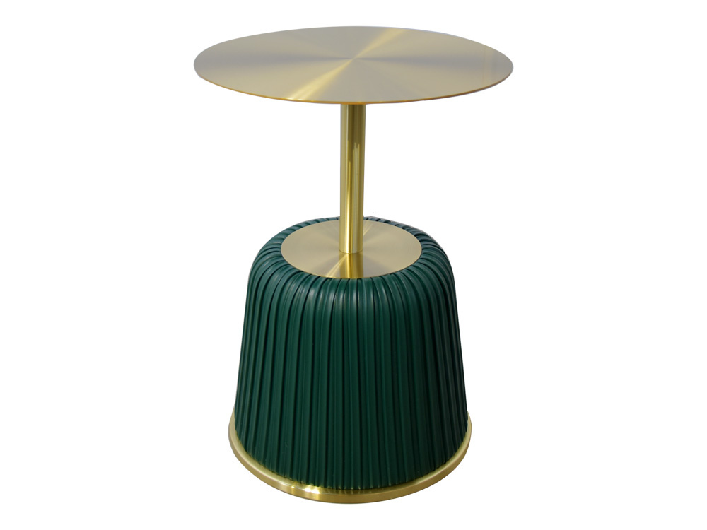 - Luksusowy złoty stolik z zieloną podstawą wykonaną z ekoskóry. Elegancki design, wytrzymała konstrukcja oraz starannie wykonane detale. Może pełnić funkcję stolika kawowego, stolika nocnego lub stojaka na kwiaty oraz doniczki.