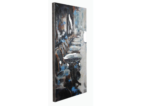 - Obraz wykonany na bawełnianym płótnie, naciągniętym na solidną drewnianą ramę. Powierzchnia dzieła wykończona strukturalną, akrylową farbą oraz srebrnymi płatkami, które tworzą piękne refleksy.