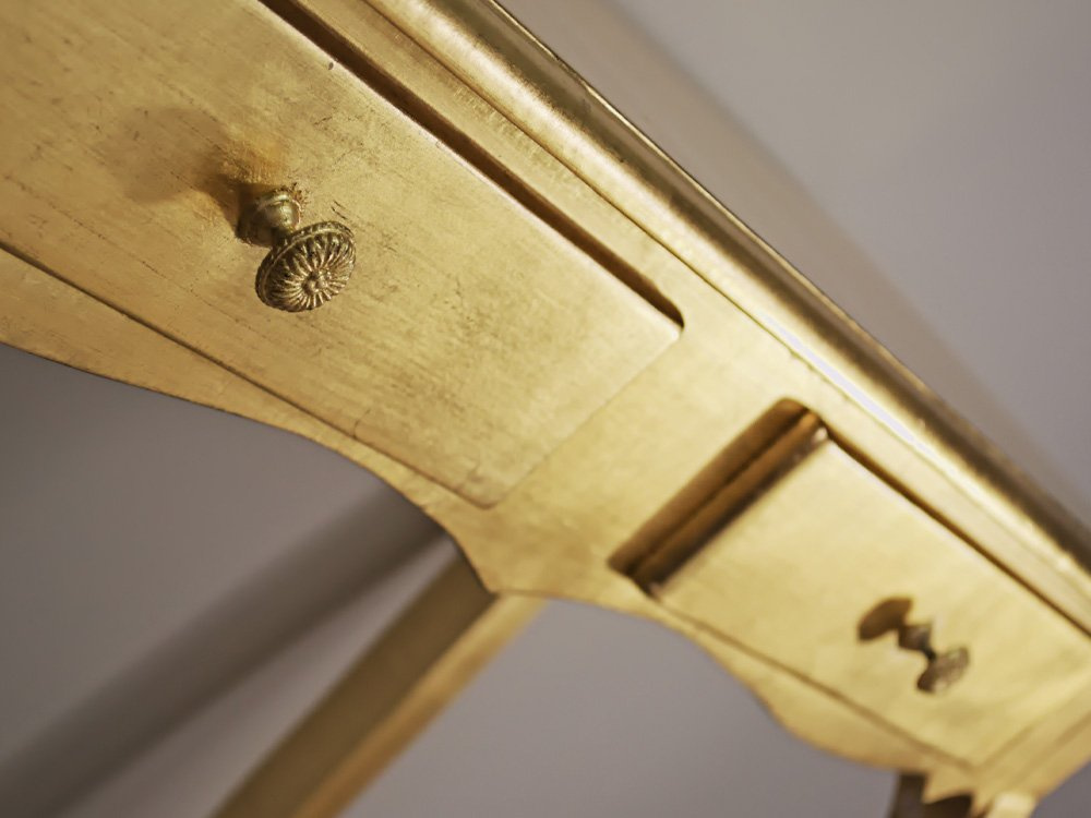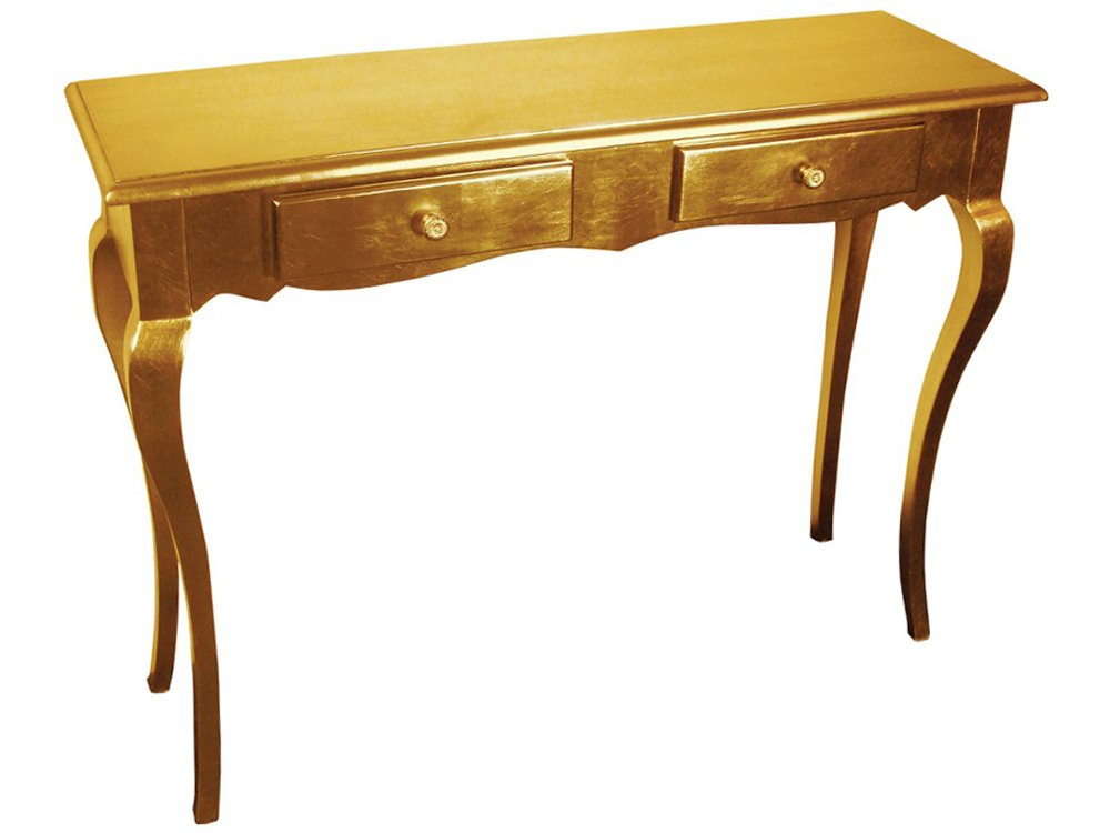 - Stylowa konsola w kolorze złotym, wykonana z wysokiej jakości drewna, pokryta złotym (szlagmetalem). Szlagmetal to cieniutkie listki metalu ręcznie nakładane i przecierane kamieniem Agatu co powoduje niepowtarzalną strukturę i kolor.