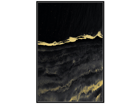 - Obraz wykonany na bawełnianym płótnie, które okala czarna rama typu american box. Model ramy charakteryzuje się niewielkim dystansem pomiędzy obrazem a oprawą. Powierzchnia dzieła wykończona płatkami złota tworzącymi piękne refleksy.
